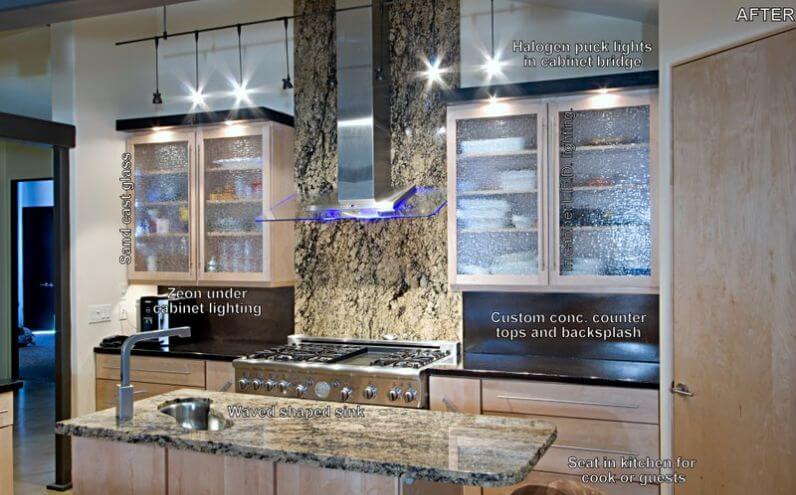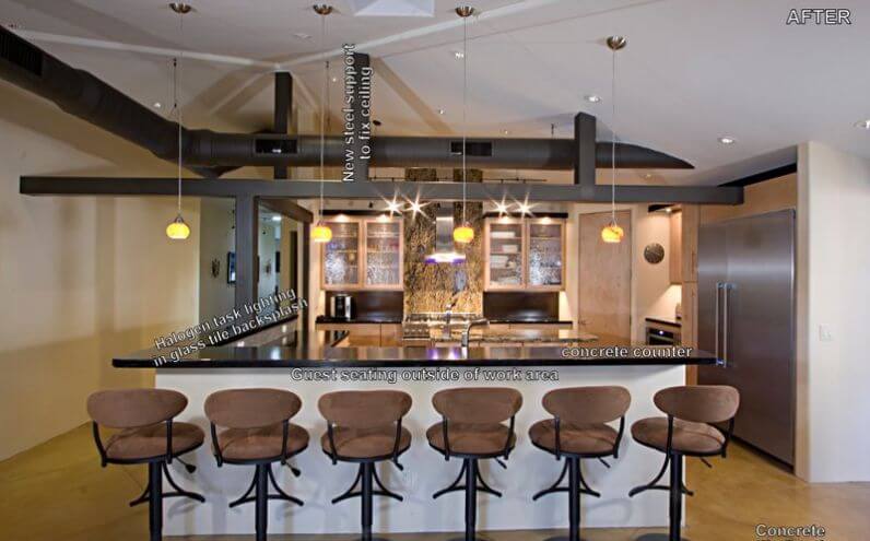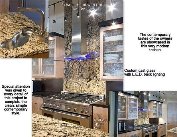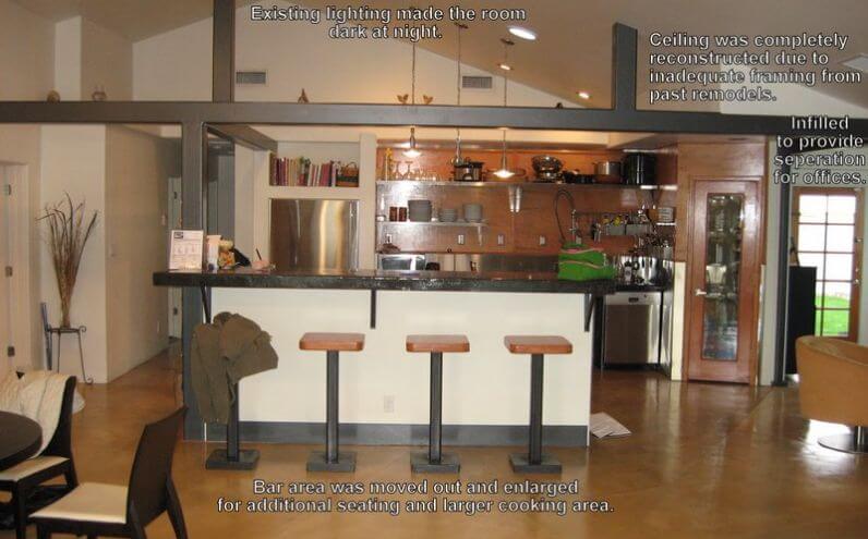 Even though the kitchen area had been previously remodeled, both its practicality and workmanship were severely lacking. We incorporated a noise-minimizing glass and steel range venting system which was mounted at the exterior to reduce noise while providing the high efficiency required. We also increased counter and cabinet space and added a walk-in pantry for bulk food and supplies. The new under cabinet drawer-style microwave helps keep the counters clutter free. The unique island sink adds charter and functionality to the chiseled granite counter top.