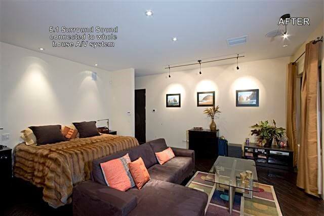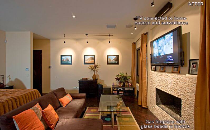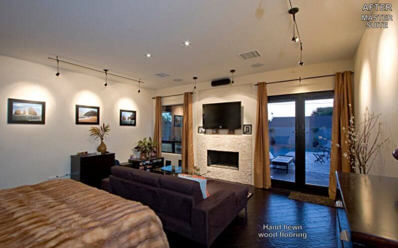The new plan allows for space and comfort in a large master bedroom, complete with sitting areas, building in TV and fireplace. Large doors allow for walk out to the pool and patio.