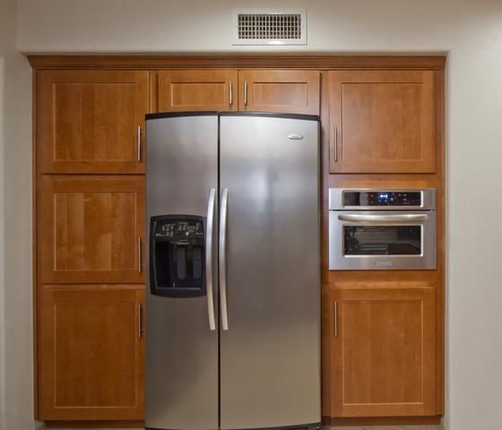 The manufactured-stone countertops provide a pleasing complement to the stainless steel appliances & vent hood in this Glendale kitchen remodel.