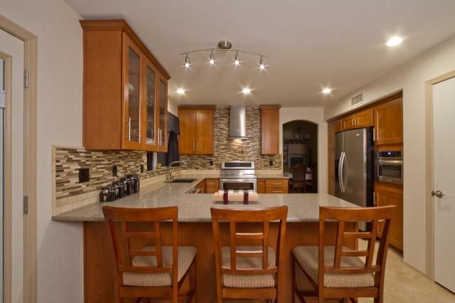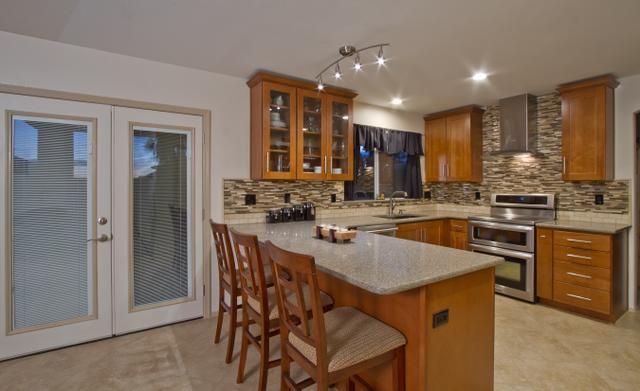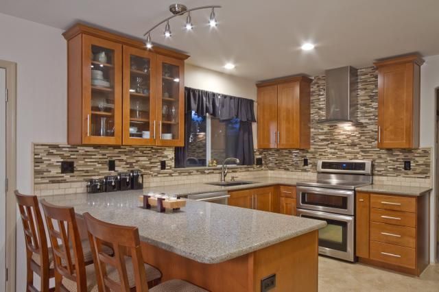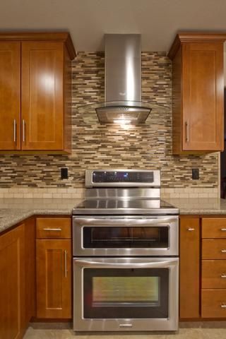 The linear travertine & glass-tile backsplash provide a dramatic focal point in this Glendale kitchen.