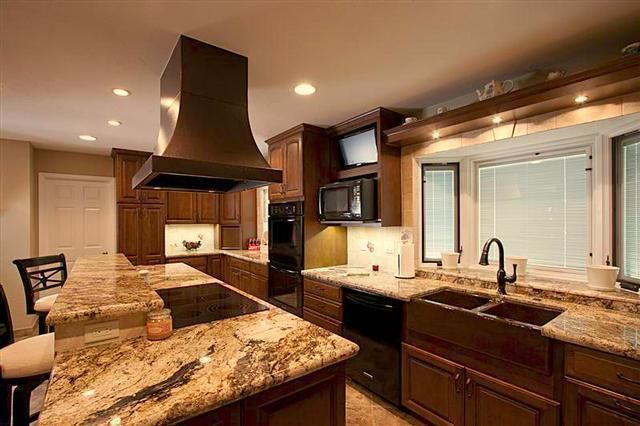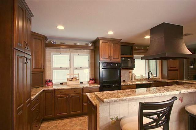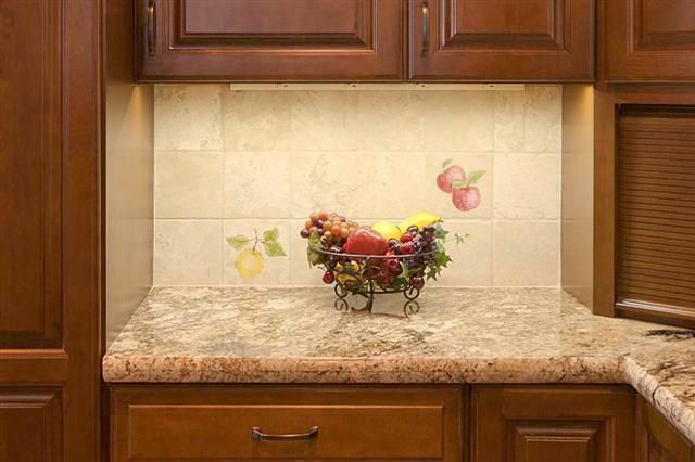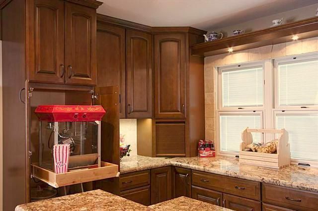 This Mesa kitchen remodel, which was named winner of a 2011 local NARI Contractor of the Year award, features accent tiles under the counter that were hand-painted by Bella Art Decor owner, Annette Grover.A popcorn machine was installed on a pull-out drawer.