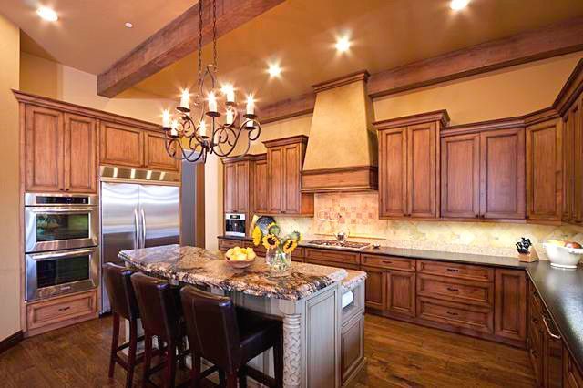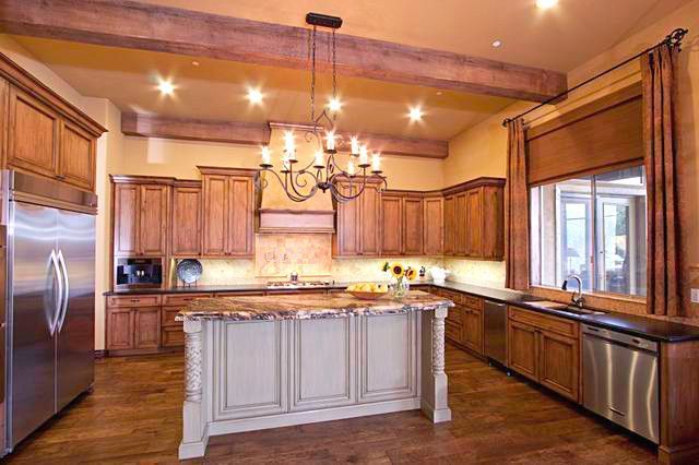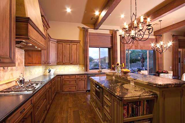 Hardwood floors, ceiling beams & wood blinds add further elegance in this Phoenix kitchen.
