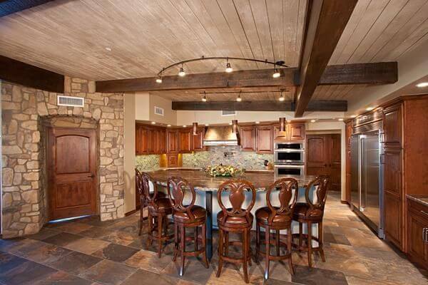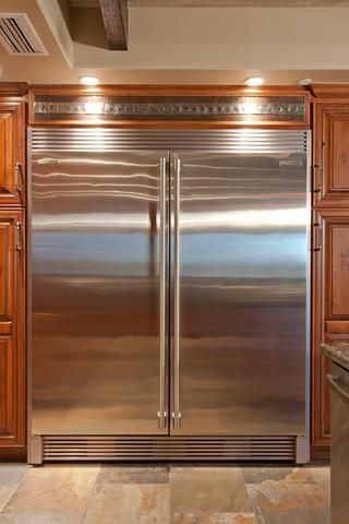 The stainless steel refrigerator-freezer provides a dramatic complement to the more rustic elements of the walls, floor & ceiling