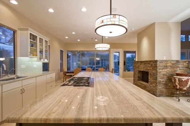 The island countertop is the prominent feature of this contemporary kitchen.