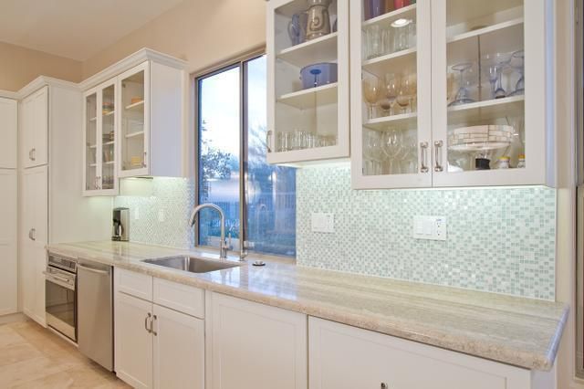 This kitchen is complete with a wine cooler, stainless steel refrigerator, glass-door upper cabinets & backsplash.