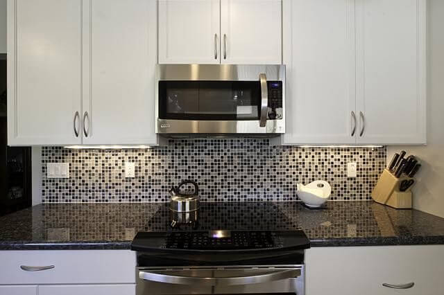The multi-colored backsplash provides the perfect correlation between cabinets & countertops.