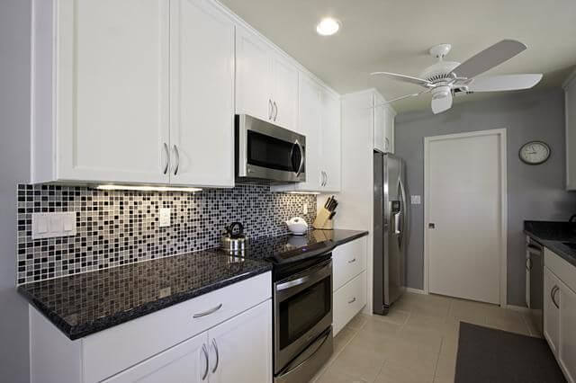 This kitchen reflects the clients’ contemporary tastes with gleaming black granite countertops & stainless steel appliances set in bold contrast to the pristine, white cabinetry & gray walls in this Tempe kitchen remodel.